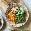 花びらのにぎわいを器の側面やふちに彫刻風に施し 立体的な花びらの凹凸を、釉薬の流れる濃淡で表現、土の風合いも出しています。 料理を盛る面は、凹凸模様が無いので使いやすく、テーブルにも映え、シンプルな色でありながら、やさしく花を咲かせます。こちらのライスボウルは茶碗としてはもちろん、小ぶりなスープ・サラダボウルとしてお使いいただいても様になります。