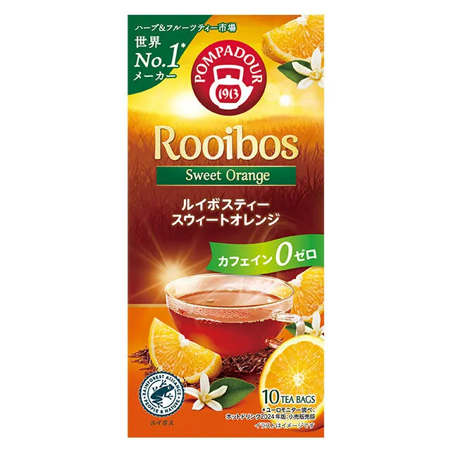 渋味がなくすっきりとした味わいのルイボスティーに、摘みたてオレンジのような爽やかな香りが引き立ちます。 【POMPADOUR】(ポンパドール)ポンパドールハーブティー 創業125年以上の歴史を持つ世界最大級のハーブ&ティーメーカーのブランド「ポンパドール」。適地適作の良質なハーブを世界中から取り寄せています。 ノンカフェイン●ティーバッグ個包装