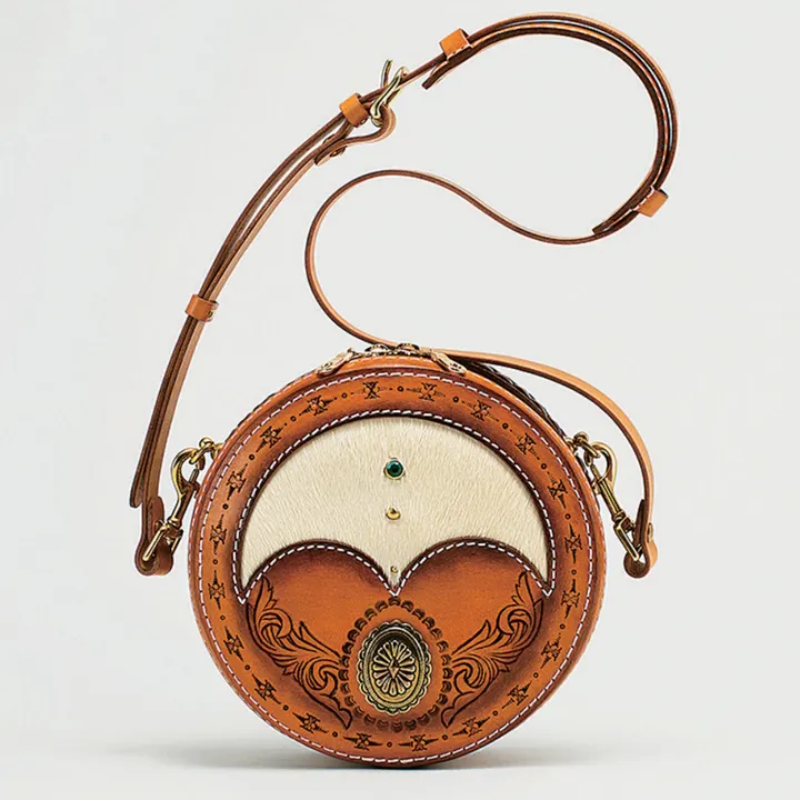 着こなしの主役はバッグ。 馬毛使いと手彫り模様のコントラストが個性的なコンパクトサイズのラウンドショルダー。