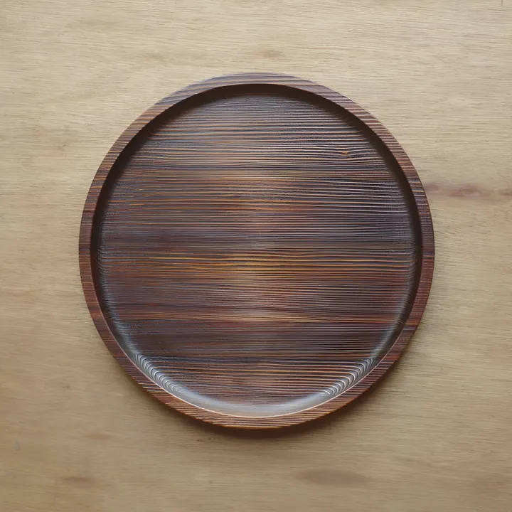 軽くて、持ちやすいシンプルな丸盆。 杉の柾目を自然素材の接着剤で貼り合せて、ろくろで削りだします。 シンプルな形と漆の色は、置いたものを引き立てます。
