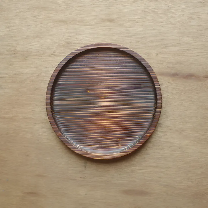 軽くて、持ちやすいシンプルな丸盆。 杉の柾目を自然素材の接着剤で貼り合せて、ろくろで削りだします。 シンプルな形と漆の色は、置いたものを引き立てます。