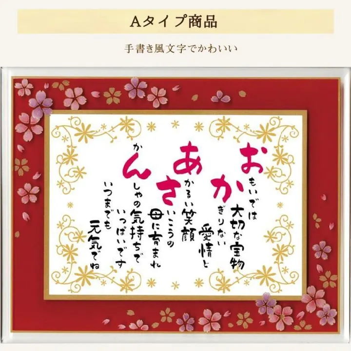 おかあさんへ、ありがとう いつもは言えないけれど、感謝の気持ちを伝えたい。 そんな想いにピッタリのプレゼント。 【商品情報】 作品はプリント品です(直筆ではございません) 額:ガラス スタンド:アクリル 付属のアクリルスタンドで自立します 白い化粧箱入り 【サイズ】 額の外形:19.3cmx24.3cm 作品:2Lサイズ 【和桜ガラスフレーム色】 赤 ※お届け商品には金額などお買い上げに関する伝票はお付けしていません。 ※ガラス製ですのでお取り扱いはご注意ください。 ※商品画像については、モニターによって色味が若干異なります事ご了承ください。 【贈る方】 お母さん 母 ママ 家族 親 女性 【用途】 敬老の日 還暦祝い 古希祝い 喜寿祝い 傘寿祝い 米寿祝い 卒寿祝い 白寿祝い 百寿祝い 長寿祝い 退職祝い プレゼント 贈り物 依頼 感謝 ギフト サプライズ お祝い 記念日 定年 母の日 誕生日 クリスマス 無料ラッピング なし なし あり ポエムの書体をお選びください Aタイプ(手書き風文字でかわいい) Aタイプ(手書き風文字でかわいい) Bタイプ(筆文字風でキリッと)
