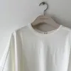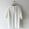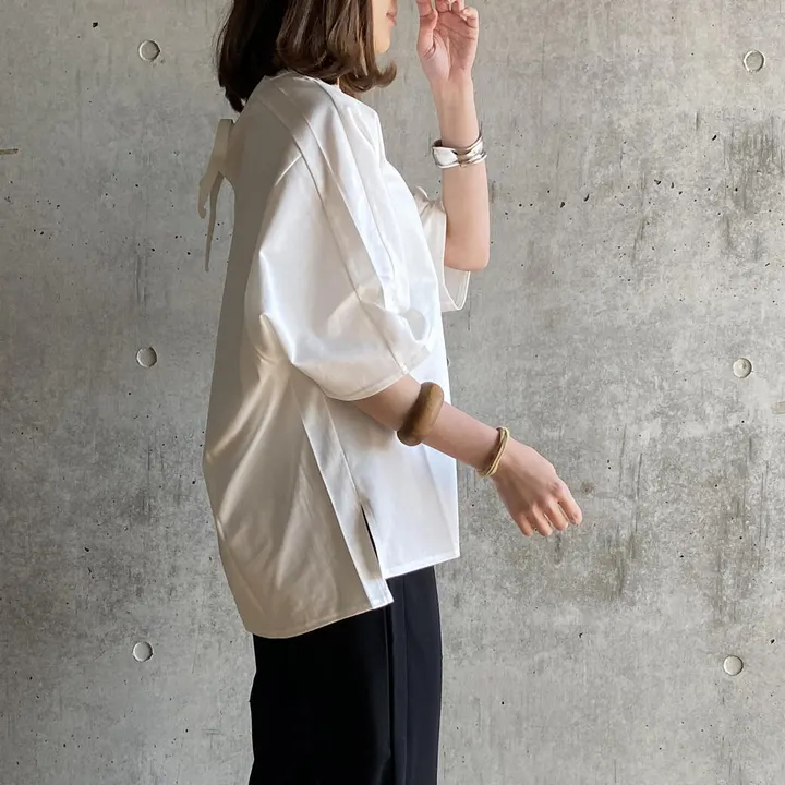 バックリボン_オーバーシルエット カットソーブラウス 背中のリボンを結ぶタイプのカットソーブラウス オーバーサイズのストンとしたシルエットです スパートやパンツにインしてもオーバースタイルでも きれいに決まる丈です リボンを結んだまま着脱できます カットソーですがブラウスのような素材で カットソーの着心地の良さとブラウスのきちんと感があり シンプルなボトムスと合わせてもこの1枚で ぐっと雰囲気がアップします スーピマコットンポンチロイヤルクール Cotton 100% 柔らかくしなやかな風合いをもつスーピマコットンコットン100%ですが上品な光沢のあるストレッチ性の高い素材です 最高級の品質を誇るピマ・コットンをハイゲージで編み極限まで毛羽をそぎ落しロイヤルクール加工を施しているので触感がひんやりとして、透けにくく柔らかく着心地がいいのが特徴です made in japan
