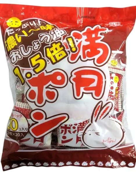 2枚ずつ小袋タイプのおしょう油1.5倍!「濃いおしょうゆ味満月ポン」です。 自然食品ですのでお子様のおやつ、子供会、幼稚園、小学校のイベントの景品としても最適です。 定番しょう油味の香ばしさはそのままに「濃い〜味」満月ポンはおしょう油を霧状にして吹き付け味付けをしています。
