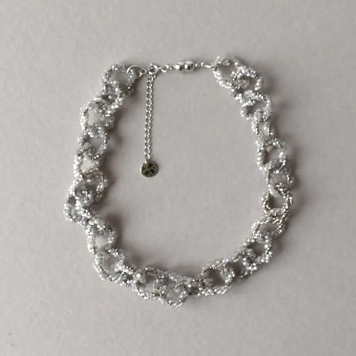 "鎖" 鎖は金属製の環をつなぎあわせてつくった綱です また、物と物とをつなぎあわせることを指します 人と人の心も繋ぎ合わせることができるならば それはとても素晴らしいことです --- カジュアルからドレスまで 合わせやすい鎖のデザインを 小さなビーズで落とし込みました やさしいシルバーの色合いは 大ぶりデザインでも肌になじみます --- material ガラスビーズ、真鍮、マグネット、テグス *シルバービーズはパラジウムッキ加工を施したものを使用しております *留め金具はマグネットタイプを使用しております size 約400㎜+アジャスター50㎜ weight 約19.0g *CACICOの商品は全て1点1点制作しているため、個体差があり、商品写真と差がある場合がございます。ご了承の上、ご購入ください。 *金属アレルギーの方はご使用をお控えください