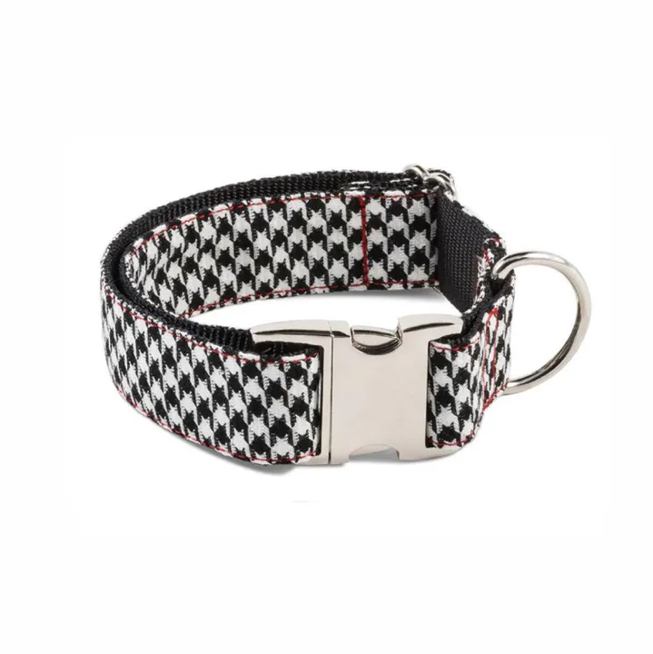 Ribesは伝統を感じさせるクラシックなデザインが魅力です。 千鳥格子や英国王室のチェック柄、タータン、ツイードなど、本物の英国プリントが秋の季節にぴったり。 異なる素材の絶妙な組み合わせで、愛犬とのおしゃれなひとときをお届けします。同柄のリードと合わせればコーディネートも完璧。 ? 高品質なブラックナイロンウェビングを使用し、手作業で丁寧に仕上げています。 しっかりとした耐久性があり、手触りも滑らかで快適。ナイロンの上に生地が縫い付けられ、洗練されたデザインに仕上がっています。 ? ? 原産国:スペイン