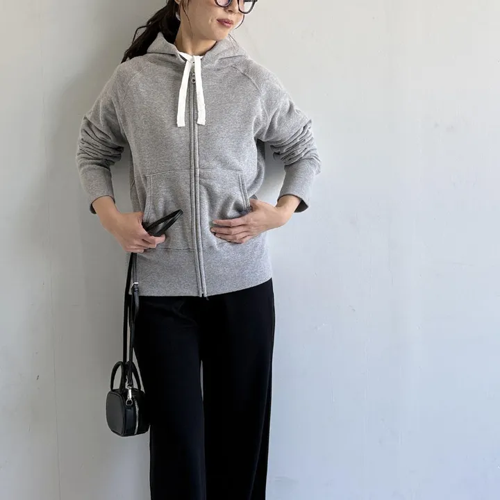 日本製 1-2(S):着丈57cm 身巾49cm 裄丈80cm 2-3(M):着丈59cm 身巾52cm 裄丈82cm cotton 100% 上質な裏毛で作ったこだわりのパーカーです 高級感があってシンプルだけど可愛いワンランク上のパーカーを楽しめます。 現存する数少ないビンテージの吊り編み機によって編みたてられた吊り裏毛を使用し、裏を羊の毛のように起毛させています。 吊り編み機は古い時代の生地には良く使われていますが、現代では希少なもです。 吊りニットは固定されたシンカーホイルでゆっくりと編みたてるため、糸に余計な負担がかからず、また、生地も機械で強制的に巻き取ることなく、自然に溜まっていきます。 そのため、洗い込むほどに実感できる手編み感覚豊かな風合い、フィット感を持ち、その特性を長期間保ちます。