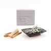 セット内容:パロサント4本+ホワイトセージ10g+アイアンと木の台 *デザインボックス入り 香料を使用しない、木が持つ自然の香りが特徴のパロサント。 ペルー産のパロサントは熟したザクロのような芳醇な香りで、幻想的に揺れる煙とともに、部屋中が穏やかな香りに包まれます。 気持ちを落ち着かせたい時や、集中力や想像力を高めたい時など様々なシーンでパロサントの香りが選ばれています。 樹脂を豊富に含んでいるため、置いておくだけで森の中にいるような優しい香りが漂います。 何千年も前からネイティブアメリカンがセレモニーでその場を清め浄化するために使用した、天然のハーブの一種であるホワイトセージ。 カリフォルニアの大地に自生する聖なるハーブを、手摘みにより収穫しています。 上質なホワイトセージは清涼感のある香りで、そのままお皿やトレイに並べるだけでお部屋のインテリアとしてもお使いいただけます。