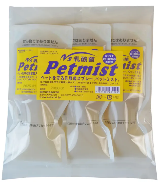 NS乳酸菌ペットミスト 専用ボトルの詰替用パウチ120ml3袋セットです。生菌でありながら雑菌が繁殖するリスクなく、病院の点滴パックのように空気や雑菌に触れずに最後の一滴まで清潔かつ安全にご使用いただけます。使用後はパウチを取替えれば、何度でも繰り返しお使いいただけます。
