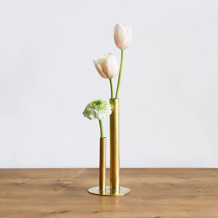 デスク周りのちょっとした癒しに数本のお花を飾ることができる本物のブラス真鍮を利用した小さなフラワーベース。 スリムなデザインなので、デスク周り以外に玄関や廊下、階段、トイレ、洗面所、窓際など、殺風景になりがちなスペースにでも華やかさをプラスしてくれるフラワーベースです。 ブラスの程よい光沢がドライフラワーや摘んできた草花の良さを引き立ててくれます。 ブラス製フラワーベースは新作のブリキ素材のアレンジメントプラントとの組み合わせも非常に相性がよく、飾り方を考えるのが苦手な人にもおススメのアイテムです。 ※水を入れた場合、変色や緑青が発生する事がありますので定期的に状態をご確認ください。