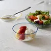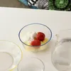 「ちょっと使いたい」がかなう11cmボウルは、ひとつあると重宝する存在。 コンパクトな見た目ながら、使い道は実に多彩。そうめん鉢や朝食のヨーグルト、夏のかき氷など、冷たいスイーツにも最適です。 日々の食卓にそっと寄り添う、頼れる名脇役です。 bitte(ビッテ) スウェーデン語で『朝早く』を意味するbitte(ビッテ)は、初夏の朝をイメージしたビビットなイエローと爽やかなブルーのラインが特徴です。 フランスのガラスメーカーDURAREX(デュラレックス)社のプレートやボウルに、ポトペリーの東京工房で1点1点手作業で線をひいたオリジナルシリーズです。 ボウルや異なるサイズのプレートと幅広いラインナップで、食卓に料理に清涼感を運んでくれるガラスの器です。