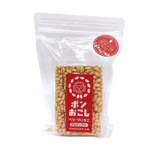 お米は、自然豊かで水がきれいな大分県玖珠産米ひとめぼれを使用しています。 すべて新米の一等米になります。お米の風味しっかり。そしてバラバラのポン菓子をくっつけただけなので、サクッとした食感が癖になります。また、塩はミネラルが豊富な宮古島の天然塩を使用しております。 大分県産のベリーツという品種のいちごで味付けをしています。着色料・香料等添加物を一切不使用なのでいちごそのままの風味を味わっていただける人気商品です。 おこしというと硬いイメージがありますが、ポンおこしはサクッと食感で食べやすく、また唾液でふやけるので、お年寄りの方にも安心して美味しくお召し上がりいただけます。 ポン菓子のようにバラバラこぼれず、チャック付きなのでちょっと小腹が空いた時にパクッと食べられ大活躍していると嬉しいお声もいただいています! ぜひご賞味ください(^^)