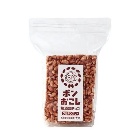 お米は、自然豊かで水がきれいな大分県玖珠産米ひとめぼれを使用しています。 すべて新米の一等米になります。お米の風味しっかり。そしてバラバラのポン菓子をくっつけただけなので、サクッとした食感が癖になります。また、塩はミネラルが豊富な宮古島の塩を使用しております。 アレルギー28品目対応、無添加のチョコレートで味付けしています。 手にベタベタチョコレートが付かないので小さなお子様でも食べやすいです。 おこしというと硬いイメージがありますが、ポンおこしはサクッと食感で食べやすく、また唾液でふやけるので、1歳くらいのお子様や、お年寄りの方にも安心して美味しくお召し上がりいただけます。 ポン菓子のようにバラバラこぼれず、チャック付きなので小さなお子様連れのお出かけ時に大活躍していると嬉しいお声もいただいています! 全国の保育園でもお取り扱いいただいている大人気の商品です。 ぜひご賞味ください(^^)