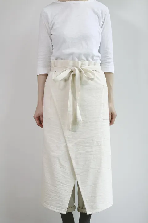 アトリエヌイ人気のオリジナル生地「ウォッシュドコットン」で作った、 腰とお尻をカバーする脚長シルエットが美しいギャルソンエプロン。 前開きの2枚重ねで足の動きを邪魔しません。
