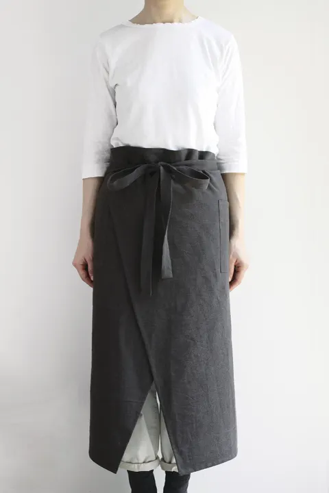 アトリエヌイ人気のオリジナル生地「ウォッシュドコットン」で作った、 腰とお尻をカバーする脚長シルエットが美しいギャルソンエプロン。 前開きの2枚重ねで足の動きを邪魔しません。