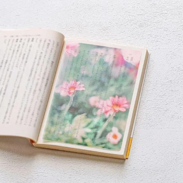 撮影した写真をPET素材に印刷した透明な栞。本に挟むと下地が透けて、文字の世界を鮮やかに彩ります。