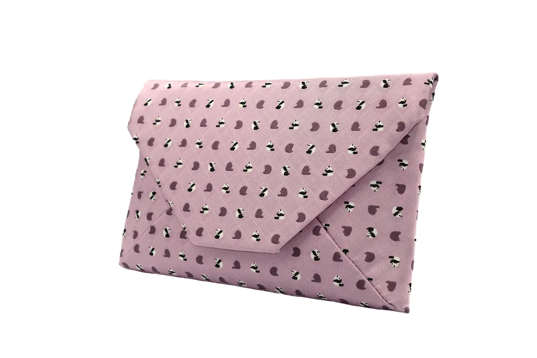 お座りパンダともぐもぐパンダのクラッチバッグ/西陣織シルク・数寄屋袋・和風クラッチ・B5サイズタブレット対応・レディース・日本製 撫子色(なでしこいろ)