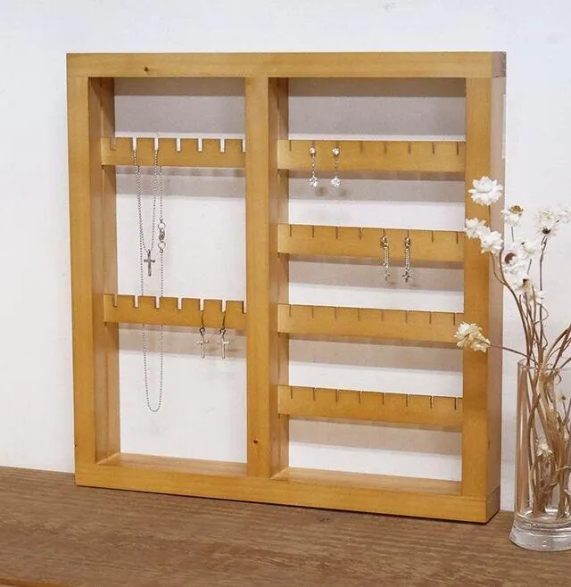 北海道 旭川市の自社工場で製作しています ピアスがたくさん収納できるラックです。 半分は、大きめのピアスやネックレスなどを 掛けられるようにゆったりスペースを 取っています。 フックタイプ、後ろからとめるタイプなど いろいろな種類のピアスをとめられる 構造になっています。 壁に掛けても、置いても使うことができます。 (壁掛け用の吊り金具を付属) ■商品サイズ 約 横幅260×奥行36×高さ265mm (板により多少の誤差が出る場合があります) ■材質 北海道産パイン材と合板を使用 木目、色合いなどが1つ1つ違います