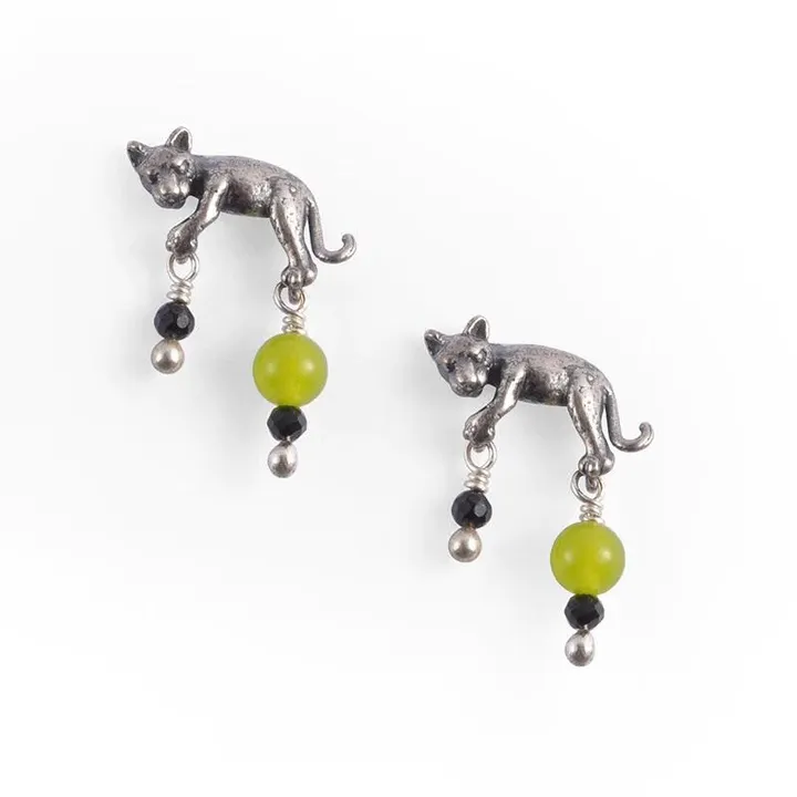 マヤでは神聖な動物とされているジャガー赤ちゃんのピアス ペリドットのさわやかな緑とオニキスの黒で落ち着いた印象のピアスです