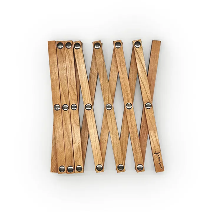 大きめのお鍋や、複数のお鍋を同時に置ける使い勝手抜群な伸縮タイプの鍋敷き。 Red Cabinオリジナルブランド「the reset」より、グラタンの大きいお皿や、ポットとお鍋など複数同時に置ける便利な鍋敷きが登場です。 横に伸縮するユニークな構造は、置く物に合わせてサイズ調節ができるのが魅力的。畳んでいる際は、コンパクトなのでスペースもとりません。 またクロスするウォールナットの素敵なデザインが、いつもの食卓をすっきりおしゃれにお料理を引き立てます。 サイズはSmallとLargeをご用意。自分の暮らしに合ったサイズをお選びいただけます。 カラーは濃い色味のウォールナット、淡い色味のブナ、ナチュラルなチェリーの3種類展開。 大人なカジュアルさが漂うウォールナット、テーブルを明るく彩ってくれるブナ、どんなインテリアともナチュラルに溶け込むチェリーと、種類でテーブルコーディネートの印象ががらりと変わります。 美しい木目と色味が素敵な鍋敷きは、どんなお鍋やポットとも相性抜群。木製ならではの、ナチュラルで温かみのある素材感もお楽しみいただけます。 板の端にはブランドロゴの焼き印がさり気なく施されており、お鍋を置いたときにチラッと見えるのもおしゃれです。 持ち運び・収納に活躍する嬉しい巾着袋付き。普段使わない時など、汚れが付かないよう保管ができる巾着袋が付属。アウトドアなど持ち運びにも便利です。 鍋敷きとしてだけでなく、あらゆる使い方にもおすすめ。キッチンカウンターなどに置いて食器置きにしたり、植木鉢をおいてインテリアとしてもおすすめです。 ※天然木のため、木目や色味は商品によって個体差があります。 ※製造工程上、折りたたんだ時に隙間ができたり、ネジの締めた高さに若干誤差がある場合がございます。 ※木の保護・強度を保つため植物性オイルを施しております。香りがする場合がございますが徐々に薄れていきます。ご使用上問題ございませんのでご安心ください。 上記のような場合は、品質基準をクリアした商品になります。こうした理由での交換・返品は対象外となりますので、予めご了承の上ご注文下さい。