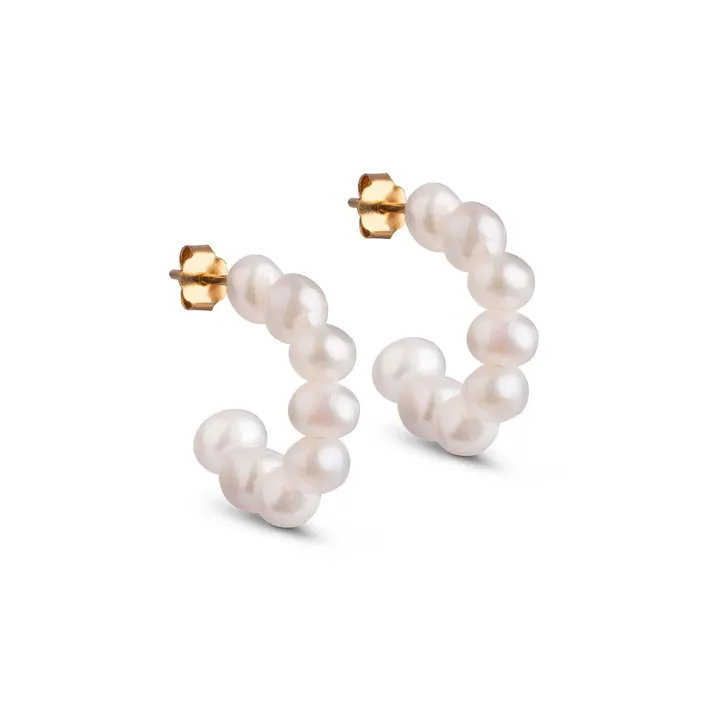 大粒のパールが連なったフープピアス。天然素材であるパールの個性がピアスに異なる表情を与えます。