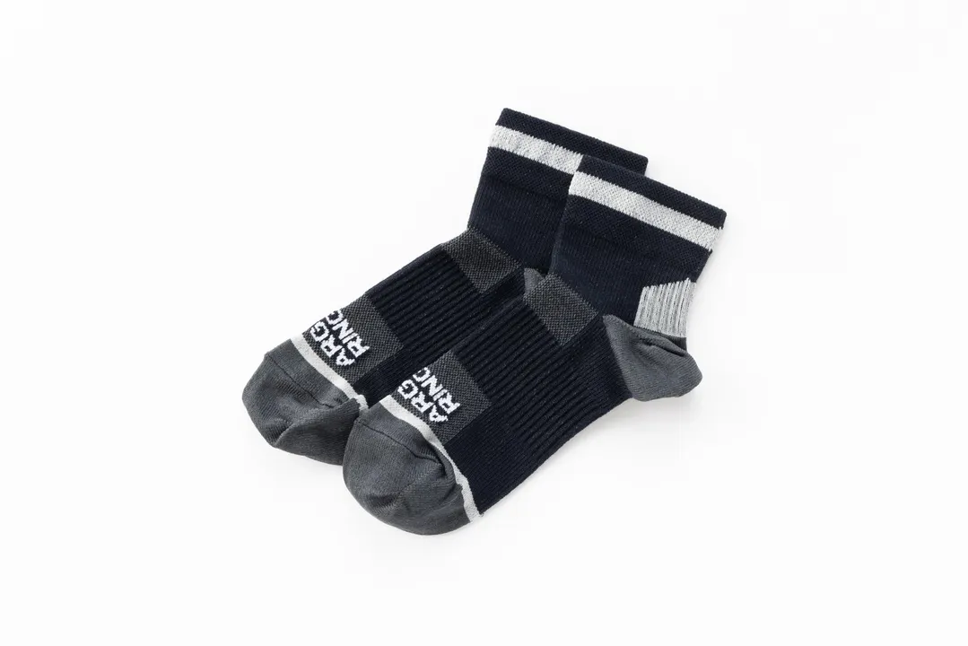 自転車専用ソックス「RING-KO(輪行)ソックス」。RING-KOソックスは、これまでの自転車ソックスにはなかった快適性と機能性を追求して開発されたモデルで、サイクリングはもちろん、輪行旅にも最適な設計となっています。 RING-KOソックスが優れている点は、まず吸汗・速乾性の高さにあります。汗をすばやく吸収し素早く乾かすため、長時間のライドでも快適さが持続します。また、フィット感にもこだわり、ペダリング時のパワーロスを抑える構造を採用。デザインは街中でのカジュアルライドにも合わせやすいショート丈とシンプルな仕上がりで、場面を問わず使いやすい一足です。 さらに、RING-KOソックスは文字通り「輪行」に最適な機能を備えています。手洗いしても一晩で乾くため、数日間の旅行でも一足で対応可能で、荷物の軽量化にも貢献します。消臭効果にも優れており、移動中や食事の際に足の臭いを気にする必要がありません。また、自転車を畳んで持ち運ぶときに合わせやすいショート丈を採用しているため、膝下ショーツなどとも好相性です。 素材にはメリノウールを使用しています。特に本製品では特許取得のハイブリッド素材「NIKKE AXIO(ニッケ アクシオ)」を採用。細くしなやかなメリノウールに、強度の高いフィラメント糸を組み合わせることで、耐久性・快適性・機能性を高いレベルで兼ね備えています。摩耗に強く毛玉ができにくいほか、汗をよく吸い乾きやすい特性を持ち、消臭効果や保温・調湿機能にも優れています。冬は暖かく、夏は放湿作用により涼しい履き心地を感じられる、年間通して頼れる素材です。 RING-KOソックスは軽量で、薄手ながら必要なサポート性をしっかり備えています。日本国内で製造されており、品質面においても安心してお使いいただけます。