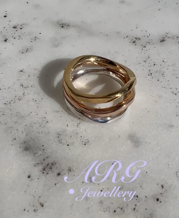 3つの異なるカラーを合わせた指輪です。色彩の変化により生まれる立体感がオシャレなアクセントになり、他のどんなアクセサリーカラーにも合わせられ、お洋服を選ばないのでとても便利です。 指輪の上部には雨垂れのような形が施されています。 雨上がりのように輝くカラードリングが、ファッションスタイルを華やかに演出します。 サイズ 8号 11号 13号 15号 /他サイズ受注商品となります。