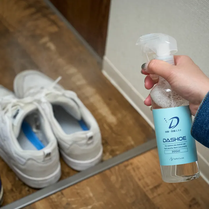 【靴臭を瞬時に消す】 従来の消臭剤では消え難かった靴の臭いを瞬時に消すことができる消臭スプレー。靴の臭いに絞って開発した。だから効く! 【消臭効果が長続き(臭いケア)】 スプレーした瞬間だけ消すのではなく、その消臭効果が長続き。新品の臭っていない靴にスプレーすることで、その靴を「そもそも臭わせない」ことが可能。だから、新品の靴と一緒にお客様に提案できる。 【無臭&ノンアルコール】 スプレー自体は無臭。だから靴によけいな香りをつけたりしない。アルコールも不使用。だから肌にも靴の素材にも優しい。 【開発ストーリー】 自信の足の臭いに困ったサフィックスの技術者が三年の月日をかけて開発した、従来の消臭剤の常識を覆す新商品。信州の森にヒントを得、信州の森に抱かれて開発。実は、ほぼ全員が靴の臭いを気にしている。だから新品の靴と共に提案して欲しい一品。 【プロアスリートも認めた消臭力】 靴の臭いで一番困っているのはプロアスリート。DASHOEはその消臭力が認められ、現在三つのプロスポーツチームの公式サプライに採用済み。 (1) Bリーグで活躍するプロバスケットボールチーム 信州ブレイブウォリアーズ (2) SVリーグで活躍するプロバレーボールチーム VC長野トライデンツ (3) 多くの金メダリストを輩出している 長野県スキー連盟 【活躍シーン】 靴以外にも、汗により臭いが発生する洗い難い物の消臭&防臭に最適。  ■靴・下駄箱・などの玄関回り  ■枕・布団・などの寝具  ■ソファー・クッション・カーテン・などの家具  ■ワキガや加齢臭(服の上からスプレーします)  ■自動車の車内やチャイルドシート  ■ジーンズ・コート・などの洗えない衣類  ■介護用品・介護部屋・などの介護用品  ■各種スポーツ・アウトドア用品 【オーガニック】 人の肌に触れるものにスプレーするのだからこそ、お子様や敏感肌の方がいらっしゃるご家庭での使用が想定されるからこそ、DASHOEは森にある天然成分のみを使用。塩素系材料やアルコールは一切不使用。また、臭いを消しきることができますので、香料を加えて消し残した臭いをごまかすことも不要。無香料。 【商品タイプ】 DASHOEは次の二つのタイプをご用意しています。ラベルの色が異なるだけで効果は同じです。各店舗様の客層に合わせて選択可能。 ■DASHOE(青ラベル) 青ラベルはご家庭でのご利用を想定。爽やかな青いラベルで、玄関に置いても消臭剤とは分かりにくいデザインを採用。  ・100ml入(バッグに入る薄い容器を採用)  ・300ml入(タップリ容量の設置タイプ) ■DASHOE for Outdoor(黒ラベル) スポーツ・アウトドア用としてのご利用を想定。黒で強いイメージを演出。  ・100ml入(バッグに入る薄い容器を採用)  ・300ml入(タップリ容量の設置タイプ) ■共通タイプ  ・DASHOE portable 20ml入(ポケットに入れて持ち運び可能)