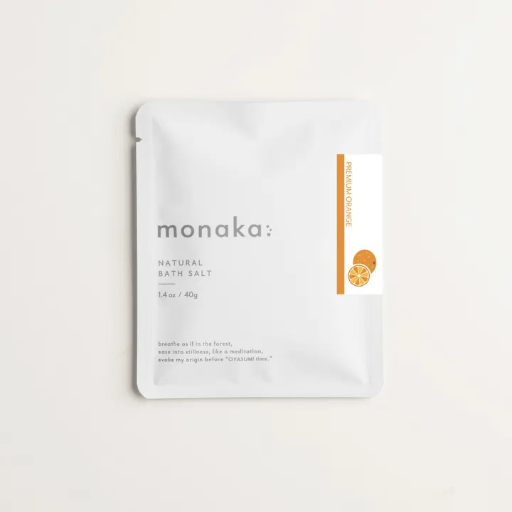 monaka ナチュラルバスソルト プレミアムみかん 40g(1回分) / 320g(8回分) 【森の中を歩くような心地よい入浴を】 目指したのは「極上のバスソルト」 花や果実、草木など、自然そのままの香りや色合いを大切に仕上げました。 まるで素材を味わうかのように浸る、優しい入浴時間。 【プレミアムみかん】 みかん精油 × みかん果皮 -みかんの懐かしさと温かさに包まれる、陽だまりの香り- まるでみかん畑!? もぎたて蜜柑に包まれて、ふと笑顔がこぼれるような香り♪ 【LINE UP】 〇プレミアムヒノキ 〇プレミアムはちみつレモン 〇はちみつジンジャー 〇ゆずシトラス 〇プレミアムみかん 〇プレミアムラベンダー 〇プレミアムローズ 〇クレイ月桃 〇キャラメルシナモン 〇キャラメルバニラ 【ミネラル豊富で環境にも優しい天然塩】 西オーストラリアの塩田で製造される「シャークベイソルト」を使用。 太陽と風の力で2~3年かけて結晶化させる「天日塩製法」で作られた塩は、環境にも優しいだけでなく、 カルシウム・マグネシウムなどのミネラル成分が豊富に含まれる。 【ヒアルロン酸Na配合】 1gで約6Lもの保水力を誇る、保湿美容成分を配合。 【使用法】 140~160Lのお湯に対して40g程度を目安に入浴前に入れてご使用ください。 付属のメッシュ袋に中身を詰めてお使いください。 【お知らせ】 ●追い焚きしないでください。 ●色や香りが残らないよう、入浴後はすぐに洗い流してください。 ●商品の特性上、LOTや時間で色や香りが変わることがあります。 ●本品は雑貨です。 【販促物】 ◇ブランドカード(A5サイズ) ◇各種香り説明カード(名刺サイズ/縦) ◇共通プライスカード(名刺サイズ/横) ご入用の方は、備考欄にてお申し付けください。 関連ブランド・・・ ◇tamamono organic = 植物の力で心と体を整える / オーガニックコスメ、アロマ ◇WAKAPLUS = 和の香りを日常にプラスする / バスソルト ◇manaplus PRO = 美容サロンなどで使用するプロユースコスメ / キャリアオイル、アロマ ◇KOTOLABO = 京都発のフレグランスブランド / 練り香水、お清めミスト ◇monaka = 素材を味わう10種のバスソルト / ヒノキ、はちみつレモン、ラベンダー など
