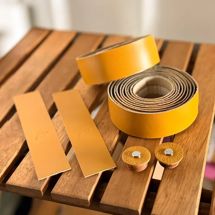 ----本革を使用した国産バーテープ ---- 自転車のドロップハンドル用のバーテープです。 手になめらかに馴染む柔らかな革が、長時間のライドでも手首の疲労を軽減します。 厚みは1.6~1.8と従来品より厚めなため、クッション性に優れています。 ----こだわりのエンドキャップ ---- 本革を重ねて作られたエンドキャップには「CuieVelo」の刻印。 フィニッシュテープ フィニッシュテープにも刻印があり、こだわりぬかれた一品となっております。 ----CuirVeloオリジナルレザー---- 兵庫県姫路市のタンナーより別注のオリジナルレザーを使用。