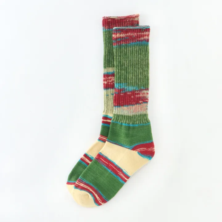 今期のテーマ『Japonisme/ジャポニスム』 かつて1800年代後半、日本はセンセーショナルに世界に登場し、世界中の注目を浴びました。 LVの「ダミエ」や、ロートレックやゴッホ、モネといった有名画家たちへ与えた影響は計り知れません。 日本ならではのモチーフや、文化風俗へのエキゾティックなカルチャーをインスピレーションに、今ふたたび、HOiSUMらしいジャポネズリーコレクションをお楽しみください。 絣(かすり)染めは、織物になったときに幾何学的または絵画的な模様を描き出すように糸を染める、日本の伝統的な織物の技法です。 この技法はインドで始まったと考えられています。 この技法で作られた美しい絹織物は、8世紀に中国から日本に持ち込まれ、奈良の正倉院で保存されているそうです。 絣の技法を編み物に応用しました。 模様の端がぼやけるのが特徴で、これが名前の由来となっています。 HOiSUMオリジナルの絣染めソックスです。