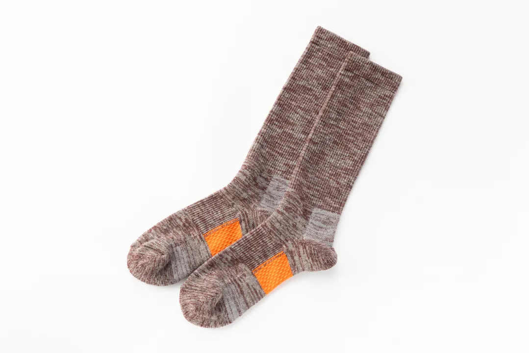 靴下の製造途中で発生する端材や編みくず、カットくずを再利用して生まれたアップサイクル素材「Looplus(ループラス)」に、ウールと高強度フィラメント糸を組み合わせたハイブリッド素材「NIKKE AXIO&©」を引き揃えて編み上げた、高機能ソックスです。環境への配慮を実現しながら、ウールならではの柔らかく快適な履き心地を両立した、“いいとこどり” の一足です。 ふくらはぎ部分にはサポート構造を採用し、優れたフィット感を実現。足底はパイル編みでクッション性と保温性を高め、足首部分もパイル仕様で保護性を強化しています。また、アキレス腱部分は摩擦に強いナイロン糸で補強し、耐久性を向上。土踏まずにはアーチサポート機能を備え、歩行時の負担を軽減します。アウトドアやウォーキング、自転車など幅広いアクティビティで快適に着用できる設計です。カラーバリエーションは5色展開で、シーンやコーディネートに合わせてお選びいただけます。