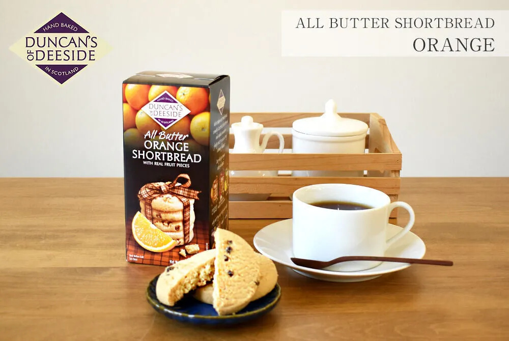 ドライオレンジををちりばめたショートブレッドです。 【DUNCAN'S of DEESIDE】(ダンカン) スコットランドの「ロイヤルディーサイド」(王族の避暑地)の山のふもとにお店を開いたDUNCANさんの母エリザベスから伝わる昔から変わらぬレシピで作られる美味しくて懐かしい味、イギリスのティータイムには欠かせないショートブレッド。 出荷 3営業日以内 内容量 200g(8枚入り) 規格 ■原材料:画像を参照ください。 ■保存方法:直射日光・高温多湿を避けて保存して下さい。 ■規格補足:パッケージ:75mm×75mm×160mm 原産国:イギリス 注意事項 【賞味期限】 納品後3ヶ月以上 裏面表示画像に記載の賞味期限は、 実際に納品させて頂く現品の賞味期限とは異なります。 画像は表記方法のご参考としてご参照下さいませ。 ■ドロップ商品について こちらの商品は先行販売商品となり生産されない可能性や、減産となり納品されない可能性がございます。 その際は後ほど連絡の上、キャンセル処理をさせていただきます。 ※送料について ご注文時に先行予約商品と通常商品を合わせた下代合計が2万円(税抜)以上でも、 出荷日が異なる場合は、個々の下代合計となります。 それぞれ下代2万円(税抜)を下回る場合は個々に送料が掛かります。