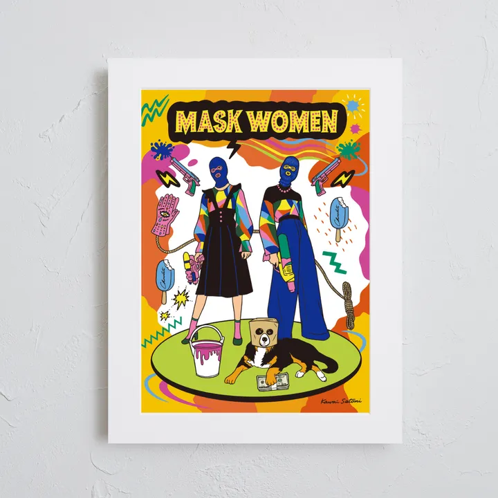 アーティスト -PROFILE- Satomi Kawai(サトミ カワイ) イラストレーター&グラフィックデザイナー 女子美術大学デザイン学科卒業 デザイン会社での勤務経て2015年フリーランスに。 ちょっとシュールで小洒落たイラストを描いています。 【作品について】 覆面の水鉄砲で強盗ごっこをしている人と犬です。 作品名:MASK WOMEN 手法:イラスト、デジタル ペーパー:高品質半光沢紙 マットカラー:白 マット*:DXホワイト芯 100%バージンパルプ/PH7・中性紙(2mm厚) ※全てのアートにマットがつきます フレームカラー:黒、白、無垢(3種類から選択) ※マット付のため通常とはフレームサイズが異なる規格となります。 【マット*とは?】 アートポスターの周りに挟んだ厚紙の事。 マットを使わない時に比べ余白により広がりが生まれ、作品の新たな一面を引き出せ作品の見栄えがグッと良くなります。また、額縁のガラス面と作品が直接触れたままにしておくと、くっついて作品を傷つけることがあります。マットを使用することでガラスと作品の間に空間ができ、作品を保護することができます。ブランドコンセプトにより全てのアートにマットがつきます。 ー ファッションのようにアートを ー 私達が掲げるコンセプトです! 毎日着替えるファッションの様に、アートも気軽に飾り変えて欲しい... 一旦飾り終えたアートにも光を当ててほしい... ポスター単体、またはリピートで中身だけのポスターを購入された方に"専用のハンガー"をセットでお届け。 「今までに無い!新しいアートの飾り方を提案」 飾る事がなくなった前のアートをハンガーにかけて洋服と一緒にかけてもらう。 その日の気分や、モチベーションですぐに取り換えられる様に。 もちろん、魅せる収納としても今までにないおすすめの飾り方です。