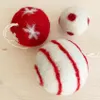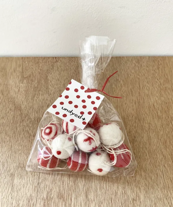 アンダイドプラスの定番人気商品のフェルトのまん丸いオーナメントにかけるための紐が付いています。 ひとつひとつ手仕事で作られています。 色は2種類、赤×白とグレー×白玉があります。 北欧風のシンプルなデザインを入れました。 模様部分は、何度も刺し、フェルト地にからませていくニードルポイント手法で制作します。ひとつひとつ、少し違う手作り感にがなんともかわいく、何度見ても飽きません。 クリスマスツリーや観葉植物にかけたり、グラスに入れて置いておいてもステキです。 クリスマス、お正月にもおつかいいただけます。 ご友人やご家族のプレゼントにもピッタリ。 3.5cm、4.5cmのサイズや同じフェルト玉を使ったガーランドもあります。 フェルトの制作はすべて手仕事で、羊毛にアルカリ性である石鹸水を含ませてもんだり巻いて転がしたりして縮絨(しゅくじゅう)させ成形します。とても手間のかかる作業です。