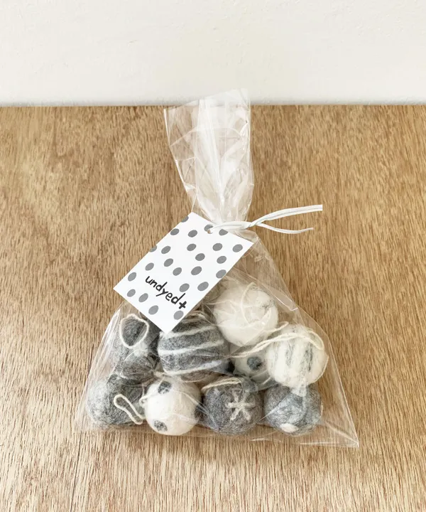 アンダイドプラスの定番人気商品のフェルトのまん丸いオーナメントにかけるための紐が付いています。 ひとつひとつ手仕事で作られています。 色は2種類、赤×白とグレー×白玉があります。 北欧風のシンプルなデザインを入れました。 模様部分は、何度も刺し、フェルト地にからませていくニードルポイント手法で制作します。ひとつひとつ、少し違う手作り感にがなんともかわいく、何度見ても飽きません。 クリスマスツリーや観葉植物にかけたり、グラスに入れて置いておいてもステキです。 クリスマス、お正月にもおつかいいただけます。 ご友人やご家族のプレゼントにもピッタリ。 3.5cm、4.5cmのサイズや同じフェルト玉を使ったガーランドもあります。 フェルトの制作はすべて手仕事で、羊毛にアルカリ性である石鹸水を含ませてもんだり巻いて転がしたりして縮絨(しゅくじゅう)させ成形します。とても手間のかかる作業です。