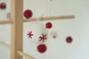 アンダイドプラスの定番人気商品のフェルトのまん丸いオーナメントにかけるための紐が付いています。 ひとつひとつ手仕事で作られています。 色は2種類、赤×白とグレー×白玉があります。 北欧風のシンプルなデザインを入れました。 模様部分は、何度も刺し、フェルト地にからませていくニードルポイント手法で制作します。ひとつひとつ、少し違う手作り感にがなんともかわいく、何度見ても飽きません。 クリスマスツリーや観葉植物にかけたり、グラスに入れて置いておいてもステキです。 クリスマス、お正月にもおつかいいただけます。 ご友人やご家族のプレゼントにもピッタリ。 3.5cm、4.5cmのサイズや同じフェルト玉を使ったガーランドもあります。 フェルトの制作はすべて手仕事で、羊毛にアルカリ性である石鹸水を含ませてもんだり巻いて転がしたりして縮絨(しゅくじゅう)させ成形します。とても手間のかかる作業です。