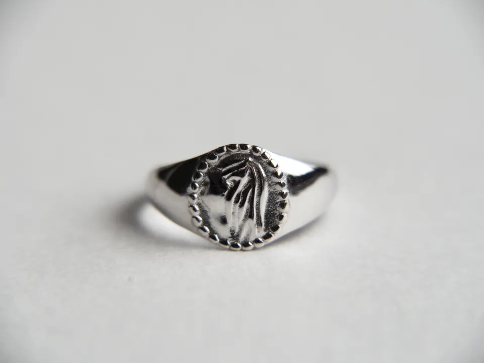 ・コンセプト 「心の内に秘めた光を引き出し、身に纏う人そのものを輝かせたい。」人は誰しも、心にきらりと輝く光を持っています。その光は、人それぞれに形が異なるからこそ美しく、素晴らしい。Rinnは、心に宿る光に寄り添うように、身につける人そのものを輝かせるジュエリーを提供しております。 「毎日身につけても壊れにくく、時を重ねるとともに肌に馴染んでいくようなジュエリーを」 Rinnは身につける人の肌と生活に馴染むジュエリーを提供しております。 ・デザイン 「他になく、永く愛されるデザインを。」 ジュエリーのデザインは、日常に溶け込んだささやかな美しさから生まれます。 例えば揺らめく布の柔らかさに触れた時や、朝陽が昇る瞬間に霞んでいたものが透き通って見えた時、感じ取った自然の美しさがジュエリーの形になっていきます。 そこへクラシカルな要素を取り入れることで、"Rinnにしかないデザイン"を意識いたしました。 お客様の生活に寄り添い続けるために、永く愛され続けるデザインにこだわりました。 そこには「親から子へと、時代を超えて受け継がれていって欲しい」という想いも込めております。どんな人にもどんな装いにも、しっくりと馴染み続けていくよう願いを込めてジュエリーを製作しております。 ・アイテム クラシックなデザインの建築物や装飾品で用いられるレリーフを元にデザインされた小ぶりなリングです。 厚みがなく、指にフィットする形でピンキーリングなどにお勧めです。 お守りのように身に付けていただけます。