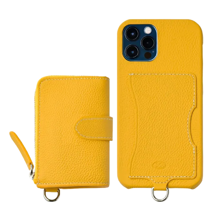 素材は、デミウルーボ の代名詞でもあるフランス産カウレザー。 L字ジップを開けると真ん中にコインスペースがあり、マチが広めで視認性と利便性を兼ね備えています。 コインスペースの両端には、カードや領収書などをドバッと入れることができるポケットがついており、 お札は三つ折り、もしくは4つ折りでしっかり収納できます。カスタムハードケースに装着できるようになっており、 シーンに合わせてスマホと財布をセットで持ち歩くことができます。 装着した状態でもそのままジップが開けられるようになっているので、取り外すことなく使用可能です。 単体としてももちろん、カスタムハードケースとセットでぜひご利用ください。 シンプルなデザインなので男女、年齢関係なくお使いいただけます。プレゼントにも最適です。 <カスタムハードケース> フランス産レザーを使った高級感あふれるレザーハードケース。 カード類を横から入れることができ、 ストラップでぶら下げても落ちないようにサイズ設計されています。 通常のクレジットカードなどは1枚、薄いカードは2枚入れることが可能です。