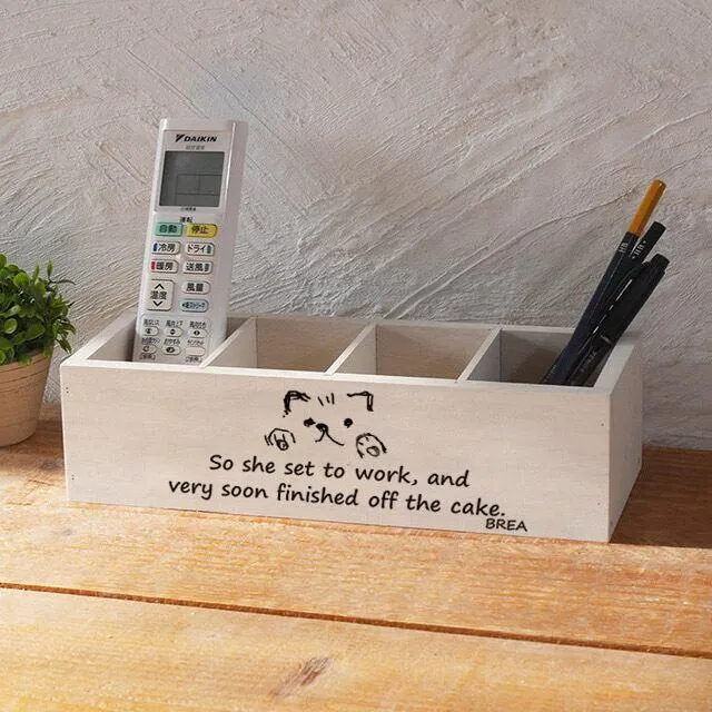 北海道 旭川市の自社工場で製作しています テレビ、DVD、エアコン… 使いたい時にみつからないリモコン。 定位置を決めてあげましょう。 デスク回りではカッターやステープラーなどの文具類を 整理したり、ペン立てとして使っても、便利です。 プリントは正面だけなので裏に返せば無地。 仕切り板は外す事ができます ■商品サイズ 約 横幅270×奥行89×高さ75mm  (板の厚みなどで、多少の誤差が出る場合があります) ■材質 桐材と合板を使用。 木目、色合いなどが1つ1つ違います。