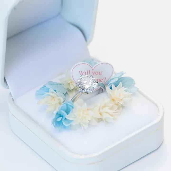 ※高温多湿の場所で保存しますと、他所への色移りの恐れがございます。プロポーズ前・特にプロポーズ成功後はフタを開けて保存いただきますよう、お願いたします。 ※リースの色・お花の雰囲気・イメージは統一していますが、全てプリザーブドフラワーとドライフラワーを使用した1点1点の手作り商品ですので、写真と若干仕様・色合いが異なる場合がございます。 ※プリザーブドフラワーは生花に特殊な加工を施し、枯れる事がなく数年美しい状態を楽しめる素材です。ドライフラワーは自然の花・葉などを乾燥させた素材です。どちらも保存状態により多少の色変わりがございます。 ※配送の際、稀に微量の素材塵がでる可能性がございます。お手数ですが、遠目からドライヤーの弱冷風を当てたり、ティッシュなどの柔らかい布等で吹き払ってください。 リングカラーとリングサイズは備考欄でご指定ください。 ※リースは繊細な作りとなっておりますので、リングケースの開閉等のお取り扱い際には、充分にご注意ください。 ※シルバー商品は空気中に含まれる成分・汗などに反応し、変色する特性がございます。月に一度ほど柔らかい布で拭くなど、お手入れください。 ※ネットでの販売はご遠慮ください。