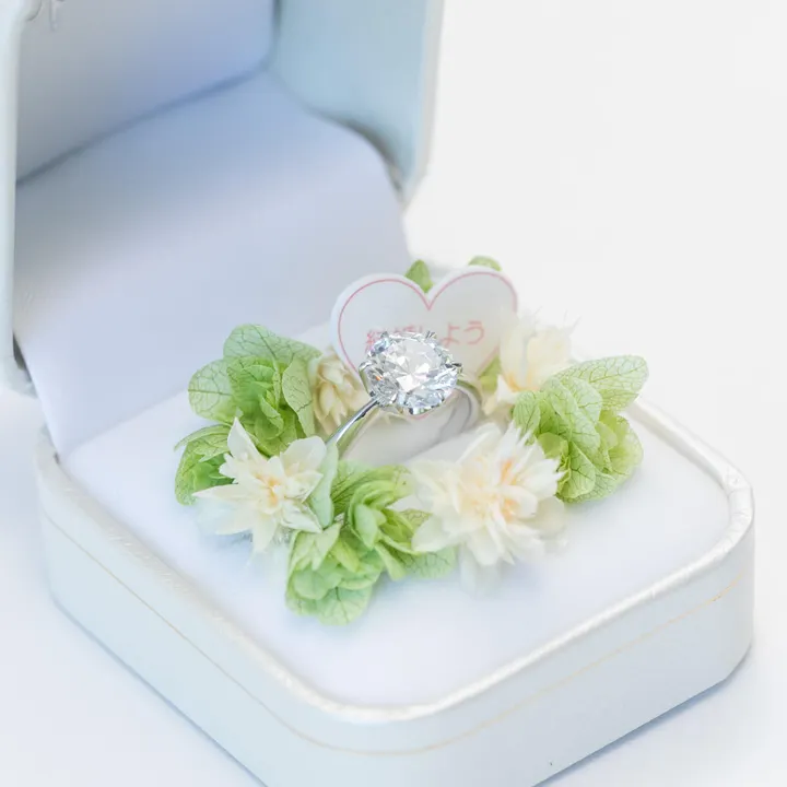 『想いと願いを誓いに!』 ギリシャ語で『誓い』を意味する『オルコス』は、彼女を想いながら選ぶフラワーヘッドリース&プロポーズリング。 あなたの届けたい想いをフラワーヘッドリースに、叶えたい願いをプロポーズリングに込めた『オルコス』は、ふたりの思い出にのこる感動的な箱パカプロポーズをサポートします。 オルコスにはプロポーズの手引と越前和紙のレターセットが同封されています。 手紙を書くことは、ふたりのこれまでを振り返り、彼女への想いを改めて強く深くできる時間でもあり、プロポーズの言葉をじっくり考えれます。 本番では手紙を読み上げるのもよいし、別れ際にプチサプライズで渡す演出もできます。 そして、オルコスと一緒に大切なプロポーズの思い出として、飾ることも出来ます。 <リングカラー展開> →シルバー →ゴールド →ピンクゴールド <リングサイズ展開> →8号 →10号 →12号 ※リングカラーとリングサイズについては、注文時にチャットにてお伺いします。