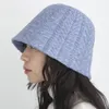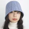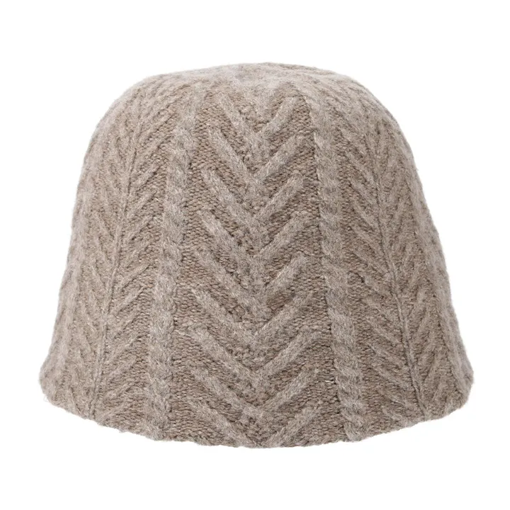 立体感のあるケーブル編みのダウンハット。色味の近い2色の糸を混ぜ合わせています。被り心地は軽くコンパクトなサイズ感です。