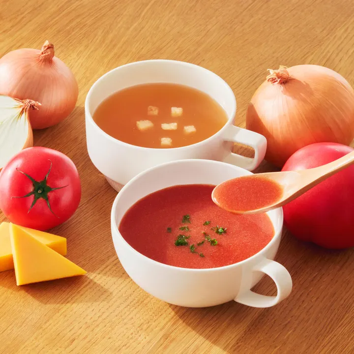 \ たんぱく質が10g以上とれて、本格的/ 素材とレシピに本気の、たんぱく質がとれるごちそうスープ。 ▼Line up ・オニオンスープ:たまねぎの甘み溶け込む。野菜と肉のブイヨン仕立て ・トマトポタージュ:旨み際立つ濃厚トマト。ほんのり香るチェダーチーズ ▼Points 《1》本格的な味わいで、1日不足分*のたんぱく質が補える。 「おいしいから、毎日続けたくなる一杯」を実現するために、味わいに徹底的にこだわりました。 *目標量下限値と平均摂取量の差(例 女性30~39歳の場合、4.2g)。目標量:日本人の食事摂取基準(2025年版)、身体活動レベルふつう(非妊婦、非授乳婦) 平均摂取量:令和5年国民健康・栄養調査 《2》1杯あたり100kcal以下で、小腹が空いた時にぴったり 更に脂質も2g以下なので、食事のプラスワンとしてだけではなく間食としてもおすすめです。 《3》いつでも手軽に、インナーケアができる 個包装型、さらに粉末スープ形態なので手軽に作って食べることができます。(熱湯130mlで溶かしてお召し上がりください) 特にたんぱく質が不足しがちな朝食と一緒にとっていただくのがおすすめです。 ごちそうと、栄養。 いそがしい日も。余裕のある日も。 おいしく手軽に、ほしい栄養を補えたら。 素材とレシピに本気の、たんぱく質がとれるごちそうスープ。 私たちのカラダに欠かせない たんぱく質が、たっぷり10g以上もとれる。 しかも、この食べ応えで100kcal以下。 お湯を注ぐだけで、どこでもすぐに楽しめる。 おいしさも栄養も、妥協しない一杯です。 本品に含まれるアレルゲン: トマトポタージュ/小麦・乳成分・大豆・鶏肉・ゼラチン オニオンスープ/小麦・乳成分・牛肉・大豆・鶏肉・ゼラチン