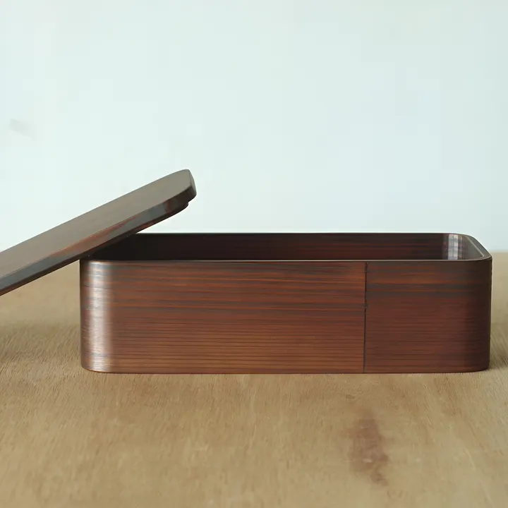 軽くて手触りのよい九州産杉の木に漆塗りをしている「呼吸する弁当箱」です。 調湿・断熱の性質があり、ご飯をおいしく保つことができます。 漆は色移りや匂い移りを防ぐので、油物や色の濃いものなど、どんなおかずも入れられます。 洗剤で洗うことができて、乾きも早いのでお手入れが楽です。 高さがあるのでおかずを詰めやすく、見た目よりも多く入る感じです。 サイズが豊富で容量や使い方でちょうど良いものが見つかると思います。 「挽き曲げ」というシンプルな伝統技法で作られ、装飾のない最小限のつくりでコストを抑えています。 接着剤も昔から伝わる漆と小麦粉で作る100%自然素材です。