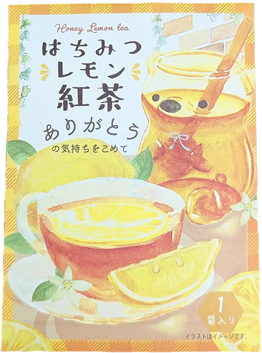 パッケージと外箱をリニューアルいたしました。 可愛いはちみつ容器のクマが描かれた袋に入った「はちみつレモン紅茶」 爽やかなレモンの酸味とはちみつの甘さが絶妙に組み合わさった「はちみつレモン紅茶」。 お湯や水に溶かしてサッとお作り頂けるので、自宅でのリラックスタイムや外出先でもお好きなタイミングでお飲み頂けます。 1袋ごとにありがとうのメッセージ付きの袋に入っているため、プチギフト等プレゼントにもおすすめです。