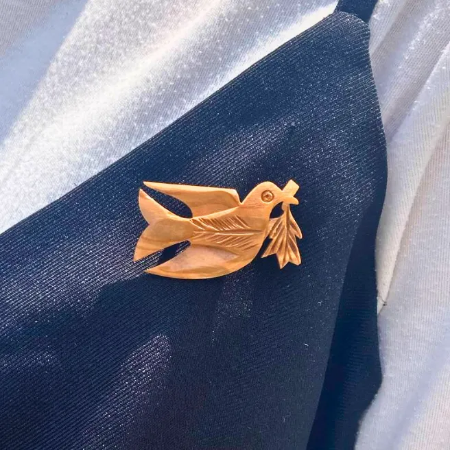 何とも愛らしい表情の鳩のブローチです。 デニム、リネン、ニットなどなど様々な素材との相性が良く、春夏秋冬活躍の場があります。 お子様からご年配の方まで幅広くお手に取っていただいている、当店の一番人気の商品です。 ◆素材の「オリーブ」について 生産地パレスチナでは紀元前からオリーブが栽培されており、樹齢数千年の古木も生えています。5-7年で実を付け始め、30~50年経つと生育を助けるために収穫の後に剪定されます。生産団体では主に50年以上の木の剪定材を使用しています。枝や幹は木材業者へ、あるいは農家から直接工房に渡り、工芸品・日用品に生まれ変わります。小さな材も捨てることなく冬場の燃料に利用されています。 ◆「架け箸」について 架け箸は「素敵に国境はない」をモットーに、フェアトレードで商品開発・セレクト・販売を行うパレスチナ雑貨専門店です。実際にホームステイをして触れた現地の人や文化の魅力を手仕事を通して発信するとともに、木製品の手入れや、天然素材と人の手が掛け合わさった歪さを暮らしに取り入れる楽しみをお伝えしています。 世代、性別を問わず手に取っていただけるような日用雑貨、台所用品、文具などを常時約40種類ほど扱っており(在庫数や原価の関係で、goooods未掲載のお品もございます)、対面販売や、自社EC、卸でのお取り扱いのほか、これまでに阪急阪神百貨店や名鉄百貨店、松屋銀座での催事にも出店しています。 ◆本商品の生産団体「Holy Land Handicraft Cooperatives Society」について 中東で一番古い世界フェアトレード連盟(WFTO)加盟団体。パレスチナ(ベツレヘム・西岸地区)で2000人の地域のコミュニティを支えており、コロナ禍を乗り越え、現在も町の柱である観光収入が全く入らない中、海外との取引を続け職人をサポートしています。