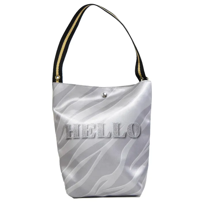ティピィカレンバケット型ワンハンドルのちょいかけバッグ。 光沢感あり、プリントの色、柄によってキラキラ感が出るサテン地の遮光生地です。 タペストリーやカーテンなどのインテリアファブリックで、生地の厚みや硬さ、強度などが高くバッグとして扱いに適している素材です。撥水ではありませんが水にも強いです。 シルバーのベースにゼブラのプリントをし、片面に折り紙風のペンギンプリント、もう片面には、HELLOのラメ風プリントでワンポイントデザインをしています。 98cmのラインテープをぐるりと使い、10cm底マチをつけたことで自立するバッグになりました。シンプルなつくりですが、少し縦長のきれいなバケット型のフォルムを出すことができました。 15mm幅のストラップをつけることで斜め掛けまでできる2WAYバッグになります。 手持ちスタイルでワンショルダーでしっくりくるデザインで、ちょっとお出かけの時のちょいかけバッグとしては必要なものもしっかり入って、コーディネートポイントにもなるおすすめバッグです。 裏地はコットンで切ポケットを2個付け、幸せワードプリントし楽しくなるバッグを目指してます。開口部はジャンバーホック止めになります。 全体の重さは180gでとても軽いバッグです。 素材やパーツなどもこだわり、プリント、縫製もこだわりながら、日本製で丁寧な仕上がりです。 両面の印象が変わるようプリントを変えて、どちらの面を気分で使い分けしたくなる楽しさがティピィカレンバッグの特徴でもあります。 ファブリックバッグの良さを追求し、オリジナルテープを使い、個性的で、高級感もあり、実用的なバッグとして是非お試しください。 デジタル染色による加工してます。