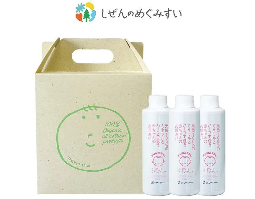 合成界面活性剤や香料等の化学物質を一切使っていない、赤ちゃんの衣類洗いふわっしゅ。万が一口に入っても害がなく、生まれたての赤ちゃんにも安心して使えます。専用のかわいいオリジナル箱に入ってプレゼントに最適です。