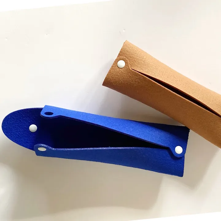 フェルト、ペンケースは、1枚のフェルトをスナップボタンでとめることによりできる心地よいボリューム感と、手にフィットするスリムなカタチが特徴です。 ペンを取出しやすくするために開口部を大きくし、清潔を保つことができるようウォッシャブルフェルトを採用。長く快適にお使いいただけるよう工夫を重ねました。 ●写真のような太めのペンは4本程、普通のペンは5本程を想定しています。ペンの長さは約150ミリ以内を想定しています。 サイズ:170ミリ×65ミリ×35ミリ